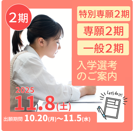 令和7年10月20日より、【第2期】の特別専願選考・専願選考・一般選考の願書受付を開始いたします。入学願書は郵送または持参による出願を受付けています。受験票は出願受付後、受験者宛に随時郵送いたします。