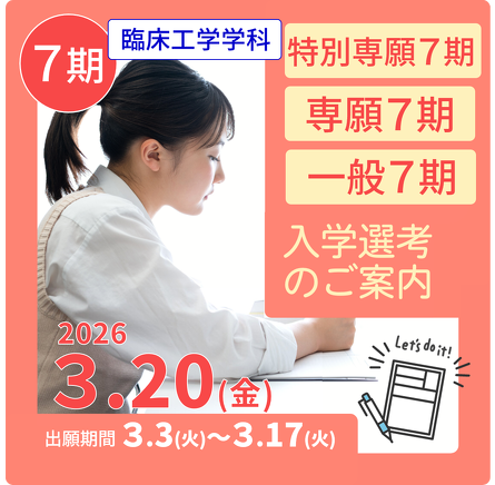 令和8年3月3日より、臨床工学学科【第7期】の特別専願選考・専願選考・一般選考の願書受付を開始いたします。入学願書は郵送または持参による出願を受付けています。受験票は出願受付後、受験者宛に随時郵送いたします。