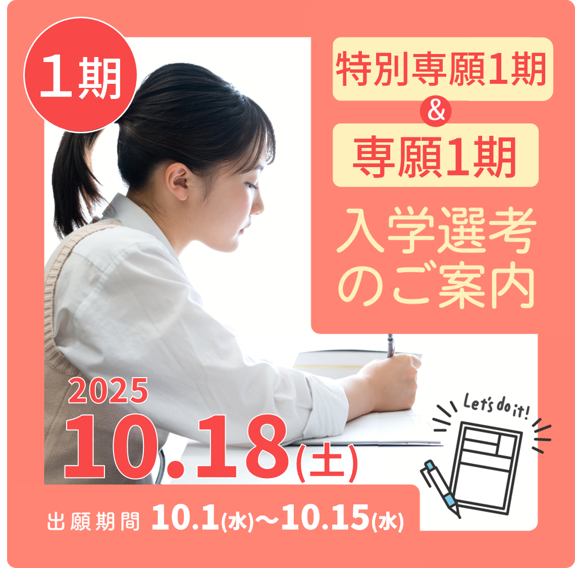 令和7年10月20日より、【第2期】の特別専願選考・専願選考・一般選考の願書受付を開始いたします。入学願書は郵送または持参による出願を受付けています。受験票は出願受付後、受験者宛に随時郵送いたします。