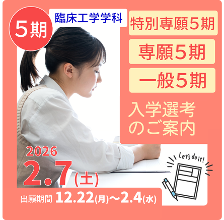 令和7年12月22日より、臨床工学学科【第5期】の特別専願選考・専願選考・一般選考の願書受付を開始いたします。入学願書は郵送または持参による出願を受付けています。受験票は出願受付後、受験者宛に随時郵送いたします。