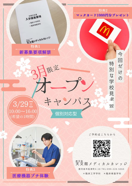 鹿児島天文館メディカルカレッジってどんな学校?そんな方に学校・入試・学費説明のほか、校内見学や医療機器の見学ができる!あらゆるご質問にお答えします!個別相談なので短時間で学校のことが知れる!医療に少しでも興味をお持ちの方はお気軽にご参加ください。友人同伴、保護者同伴も可能です。